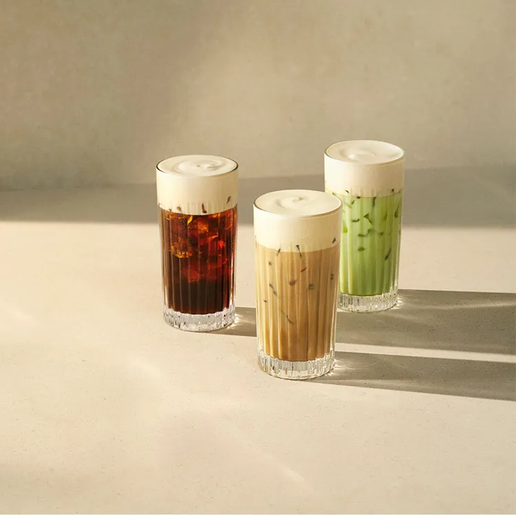 Iced Latte finalizado com Cold Foam de Proteína com sabor a caramelo (sem açúcar). Também em versão hot.