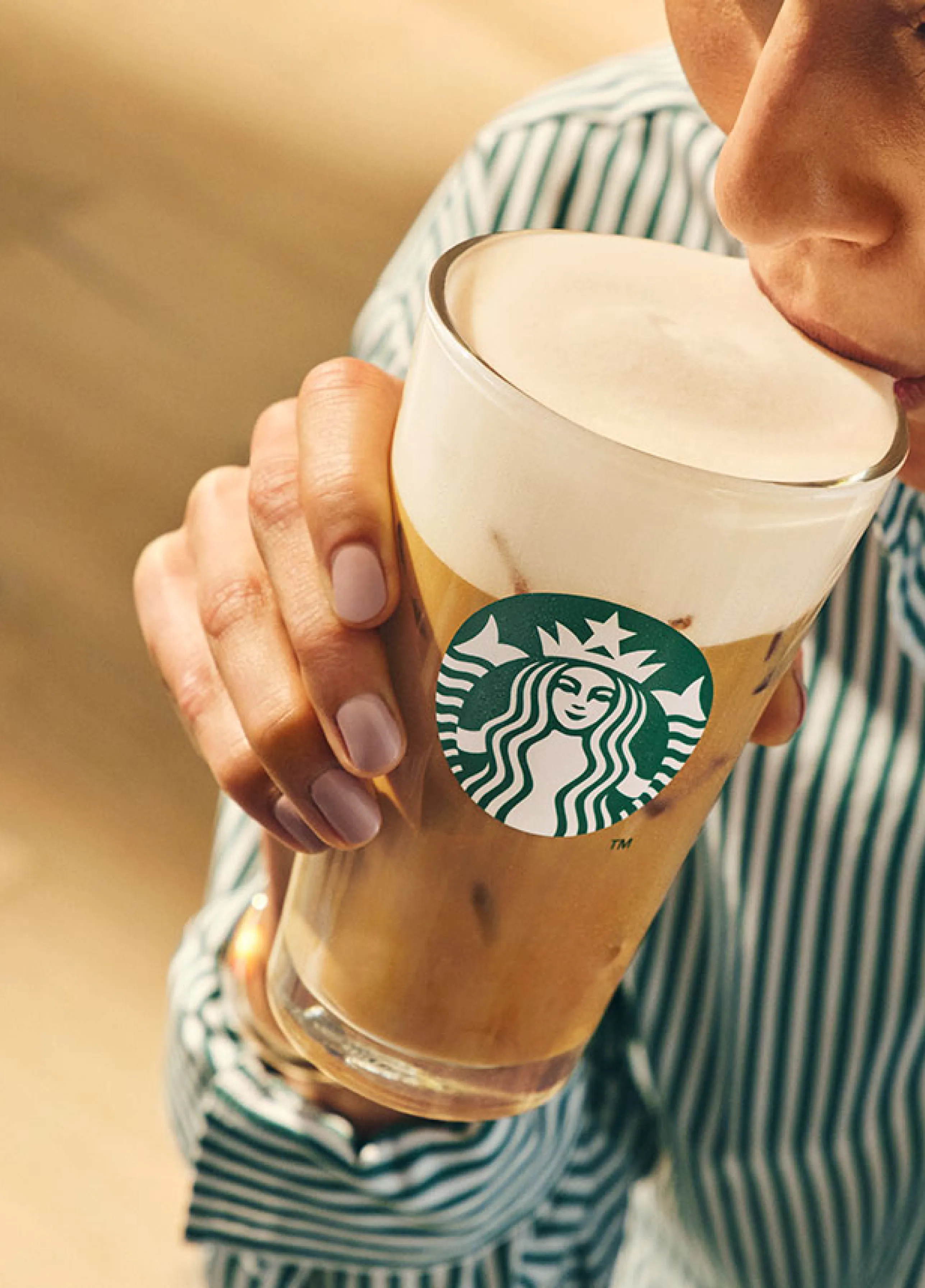 Iced Latte finalizado com Cold Foam de Proteína com sabor a caramelo (sem açúcar). Também em versão hot.