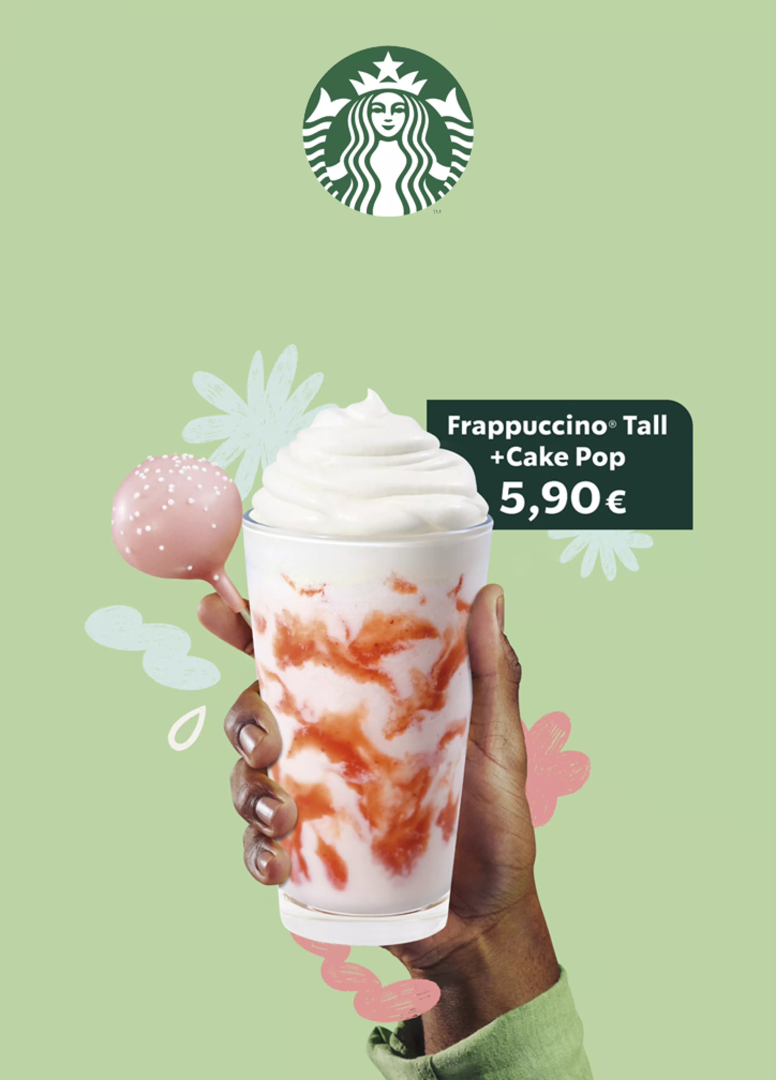 Peça o seu Frappuccino® favorito, tamanho Tall, e acompanhe-o com um Cake Pop (delicioso bolo perfeito para acompanhar a sua bebida). Promoção disponível durante todo o dia. Só por 5,90€*